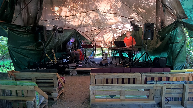 Vorheriges BildNächstes Bild Weidendom13 Jürgen und Cello beim Soundcheck für unser letztes Garten-Konzert der ersten Saison, …